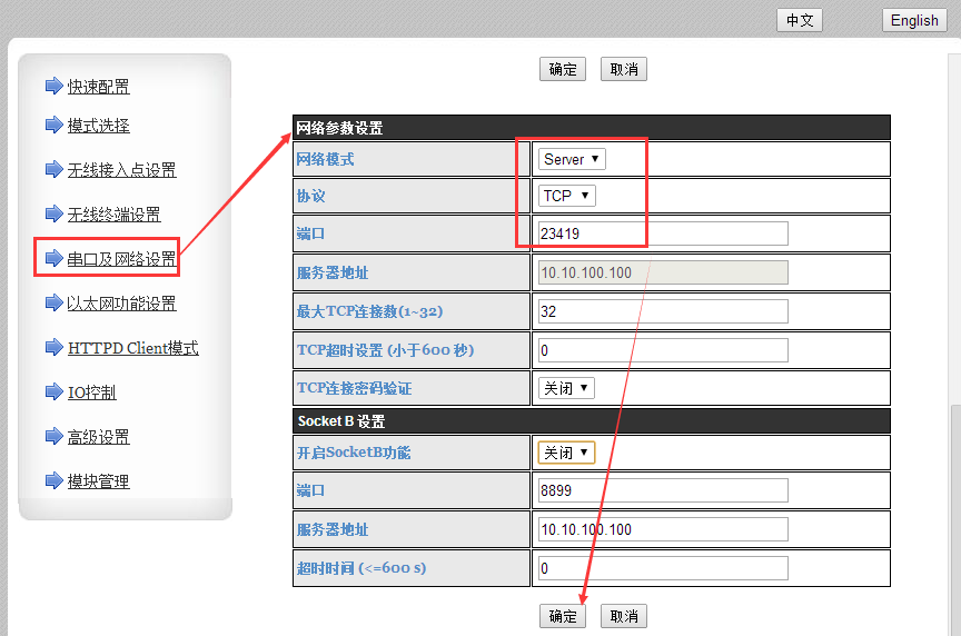 4:在串口及其他設置中,串口設置根據用戶設備更改設置。在網絡參數設置中,網絡模式設置為TCP Server .端口號設置為23419。點擊確認