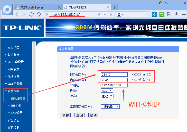 6:路由器配置:在路由器的虛擬服務器,設置端口映射。服務端口和內部端口都設置為23419