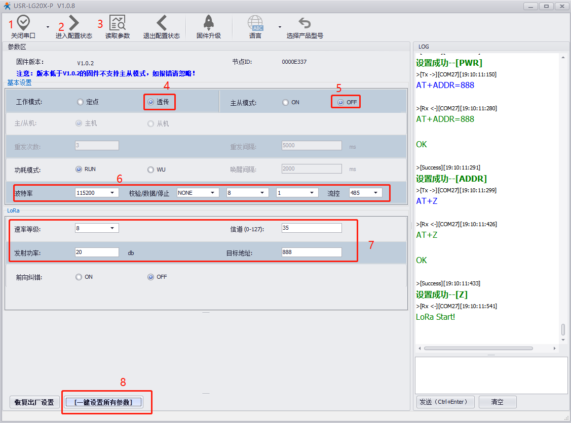 打開LoRa設置軟件(LG207和LG206-P選擇同一個),依次點擊打開串口(選擇A、B對應的串口號,串口參數:115200,None,8,1,NFC)、進入配置狀態、讀取參數、配置上表中的參數、一鍵設置所有參數,關閉LoRa設置軟件。