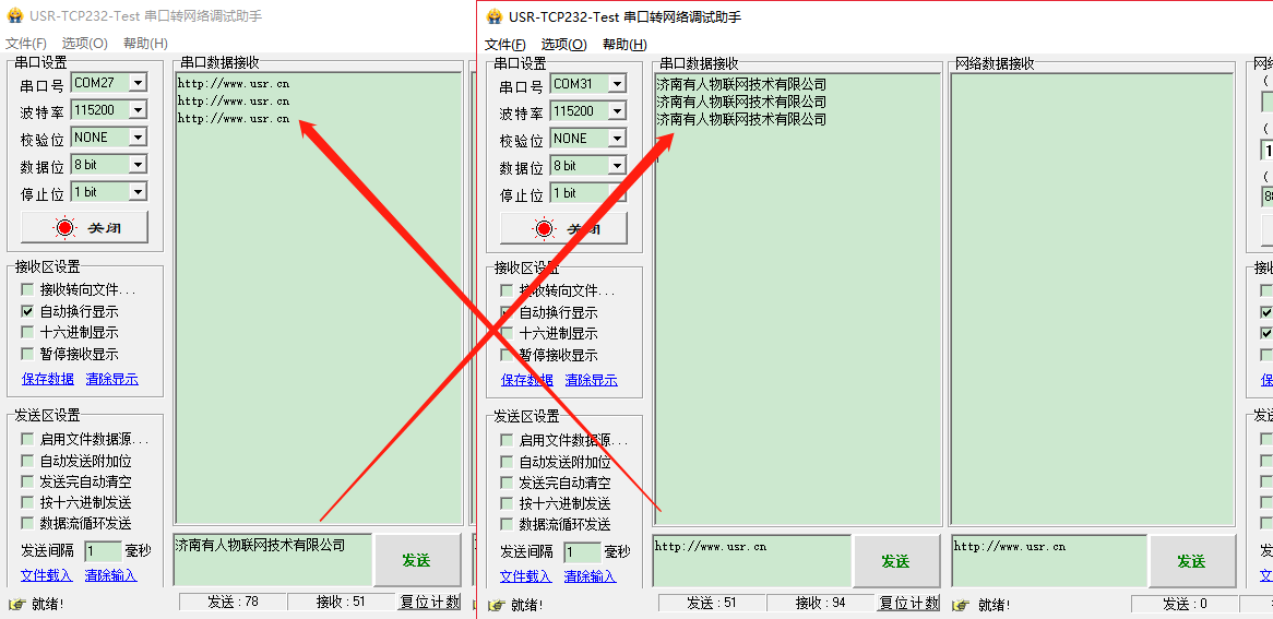 (3)啟動兩個USR-TCP232-Test(模擬串口設備1,2)分別連接LoRa數傳終端A、B的串口,使用串口設備1發送數據串口設備2可接收數據(反之亦然),通信效果如下圖所示: