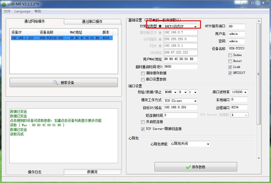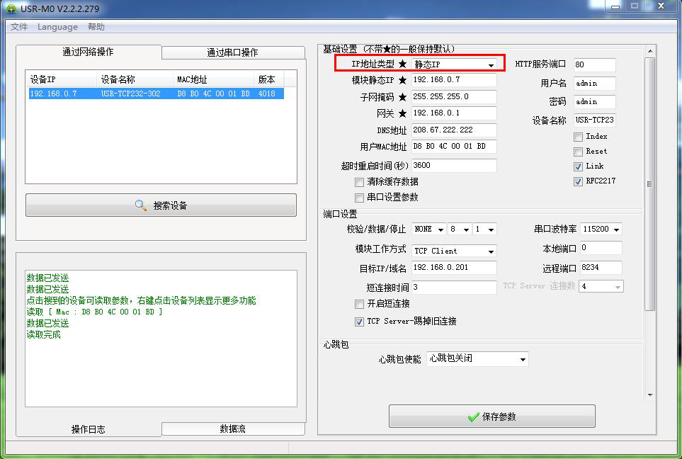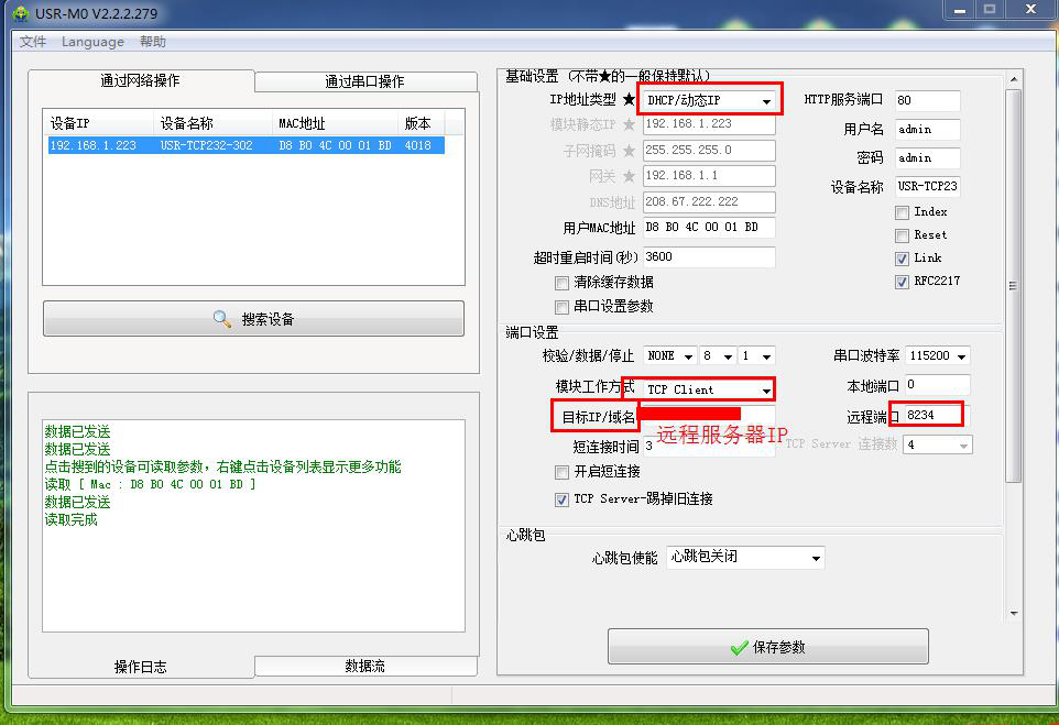 2、 用M0設置軟件將302設置TCP client,目標IP填遠程服務器地址。遠程端口填遠程服務器的端口號。