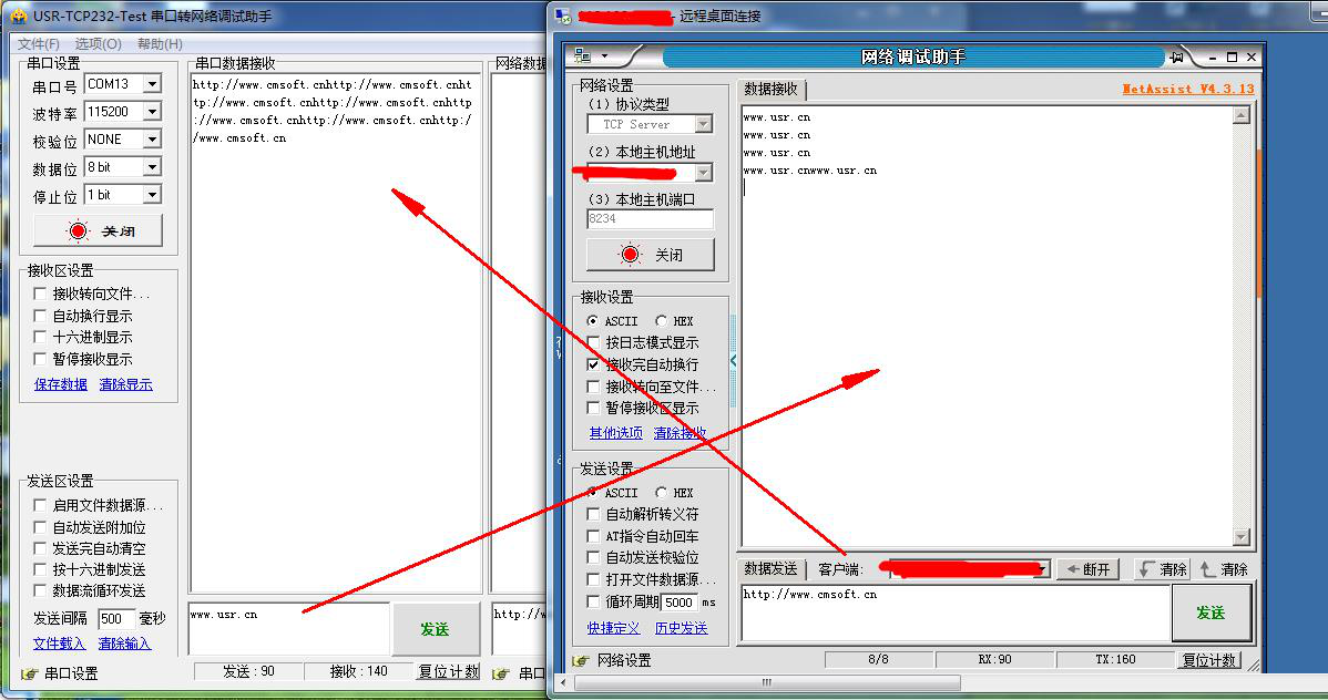 3、 302連接遠程服務器成功,測試數據透傳