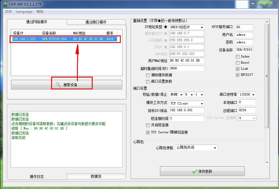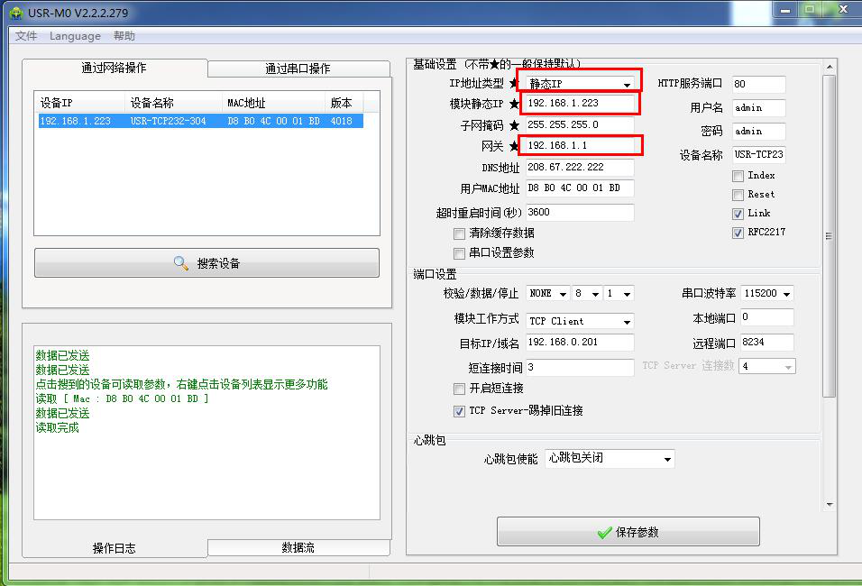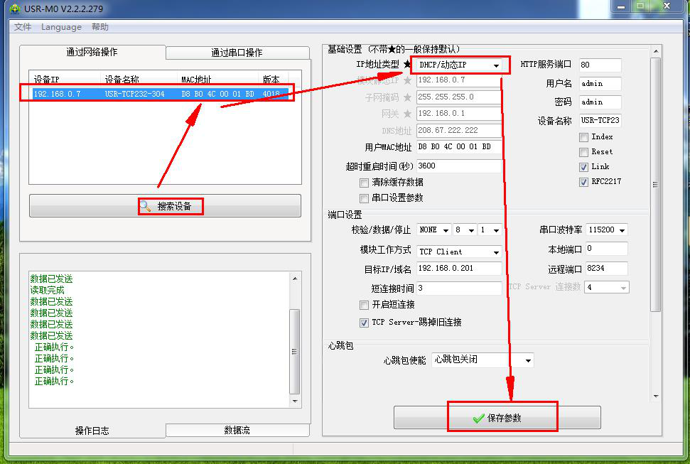 2、 用M0設置軟件將304設置TCP client,目標IP填遠程服務器地址。遠程端口填遠程服務器的端口號。