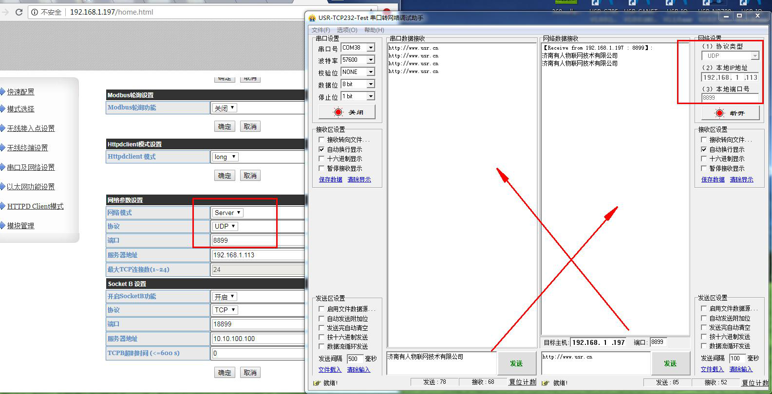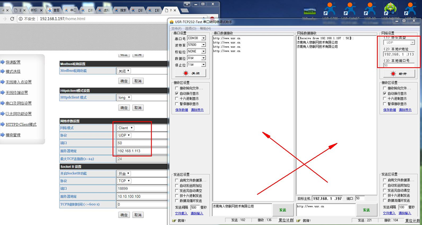 USR-W610IP  登錄USR-W610的網(wǎng)頁(yè),然后修改W610的串口參數(shù)。測(cè)試4種工作模式下,串口和網(wǎng)絡(luò)的數(shù)據(jù)透?jìng)鳌?/span>