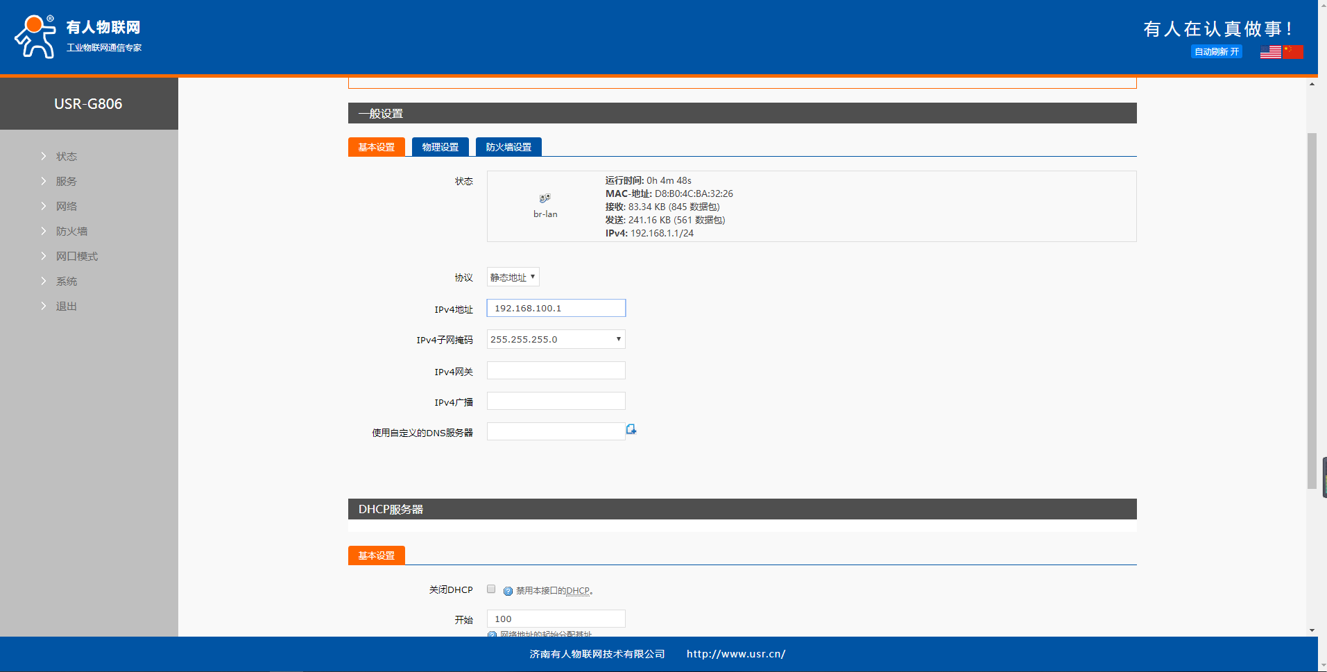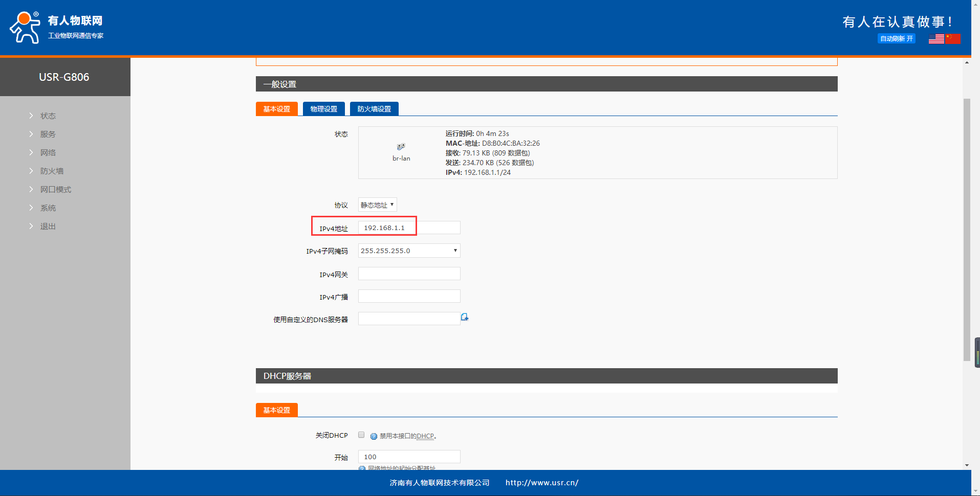 2、出廠默認,G806的LAN口IP為192.168.1.1