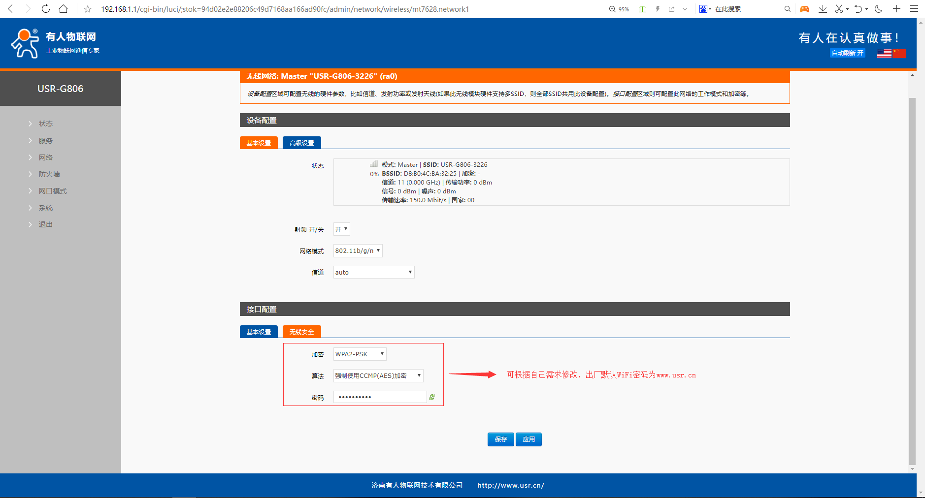5、 在接口配置---無線安全中可以修改該WiFi的加密方式,默認加密方式為WPA2-PSK,默認密碼為www.0575400.com