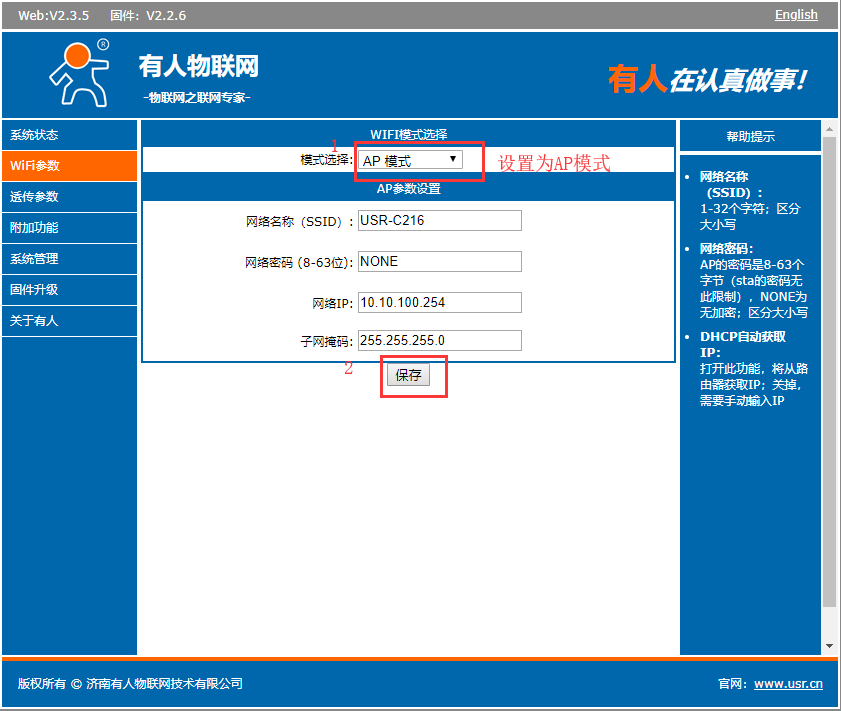 1、進入內置網頁,216出廠默認AP模式,默認參數:115200,N,8,1