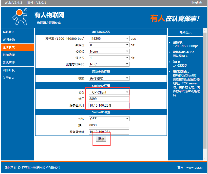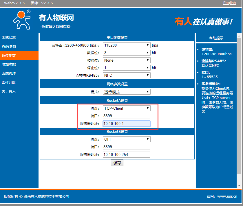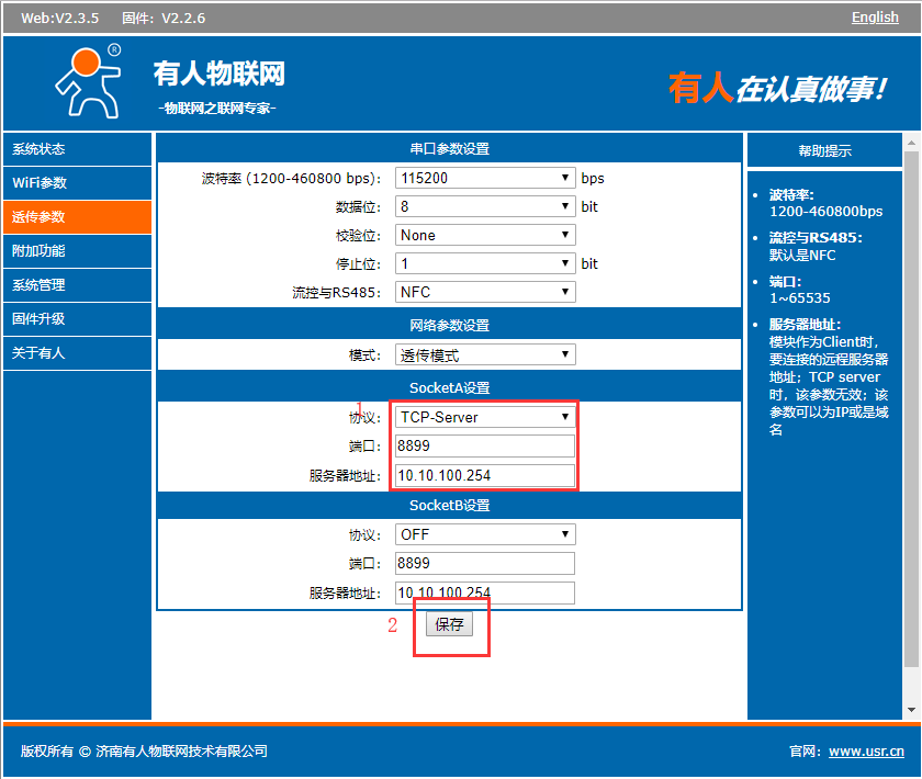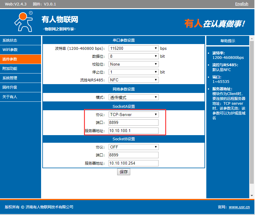 選擇協議:TCP-Server 端口號:8899 IP地址:10.10.100.1 設置完成后保存,重啟