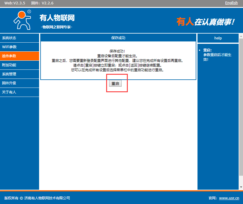 設為STA模式的216做client,端口號要和為AP模式所設置的端口號一樣,ip地址為AP模式所設IP地址,設置完成后,點擊保存,點擊重啟,所配置的參數均在重啟后生效