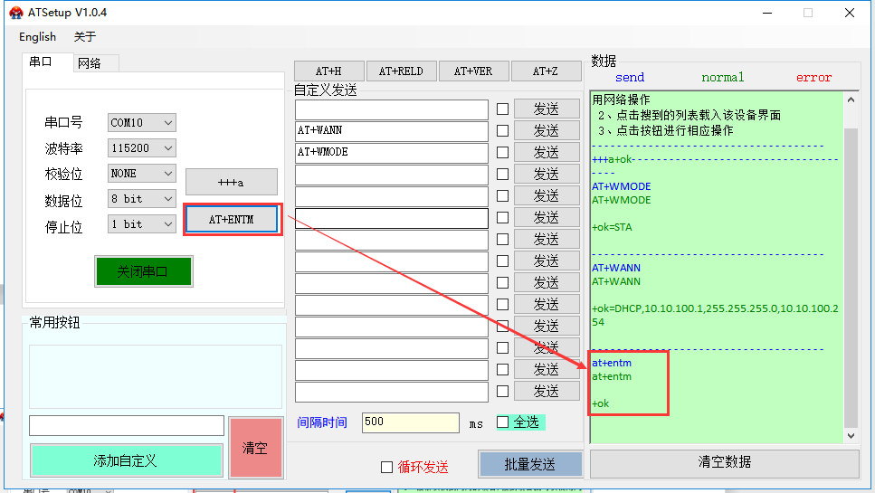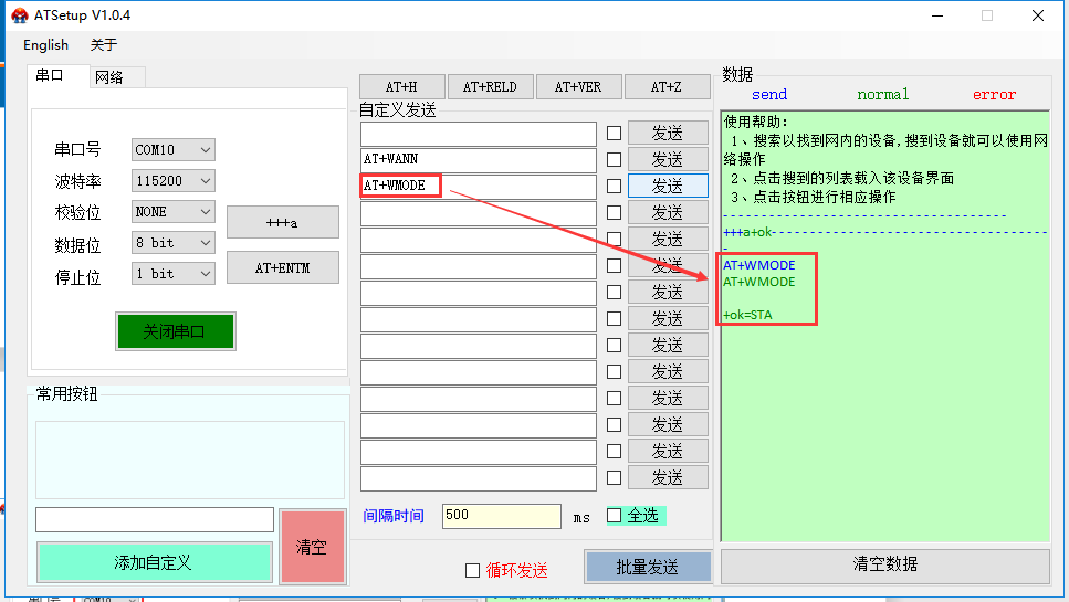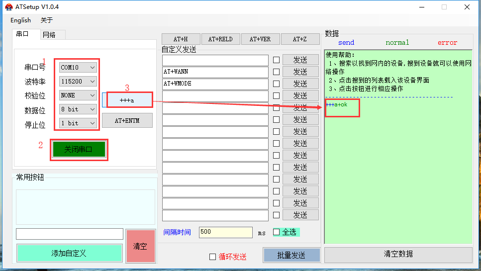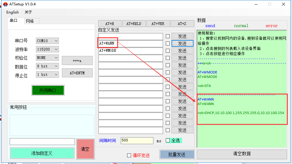 2、打開AT指令軟件,選擇相應的串口號,以及串口參數(默認:115200,N,8,1),打開串口,點擊“+++a”進入配置狀態,用AT指令:AT+WMODE查詢模塊所處工作模式,用AT+WANN查詢模塊的IP地址,退出配置狀態,關閉串口。(其他AT指令您可以參考軟件設計手冊41頁)