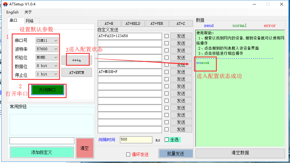 ,依次點擊打開串口(選擇A、B、C對應的串口號,串口參數(shù):57600,None,8,1,)、進入配置狀態(tài)、發(fā)送AT指令進行配置。
