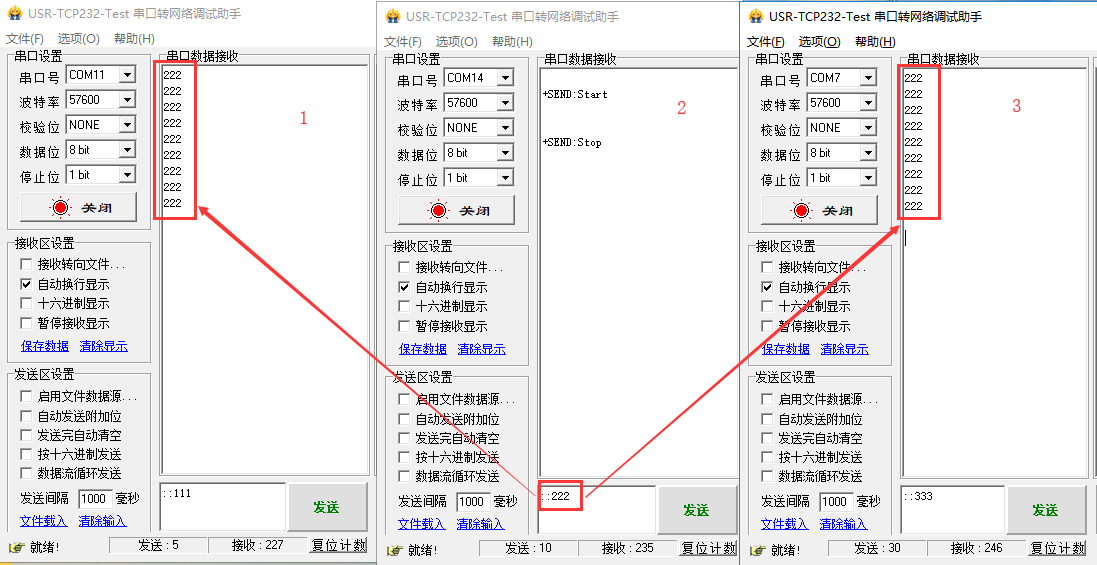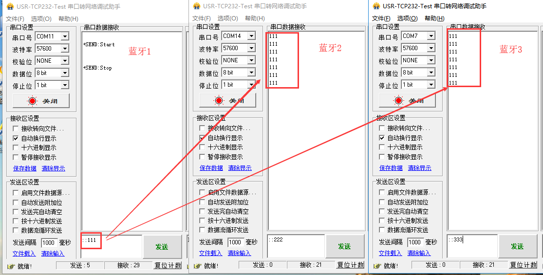 由于組網(wǎng)的原理所以導致每次發(fā)送的數(shù)量不大于 20 字節(jié),并且傳輸過程中會有一定時間的延遲(根據(jù)信號 強度等決定),并且不能確保數(shù)據(jù)準確的送達,請根據(jù)實際應用環(huán)境進行調(diào)整。注意:在每次發(fā)送數(shù)據(jù)前請加 兩個::(兩個冒號),例如要發(fā)送的數(shù)據(jù)為111,則實際需要輸入的為::111