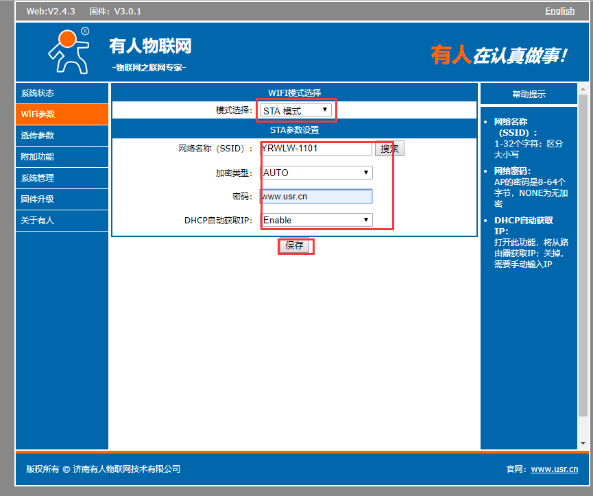 3、設(shè)置為STA模式,設(shè)置要連接的無(wú)線路由器名字和密碼,點(diǎn)擊保存。