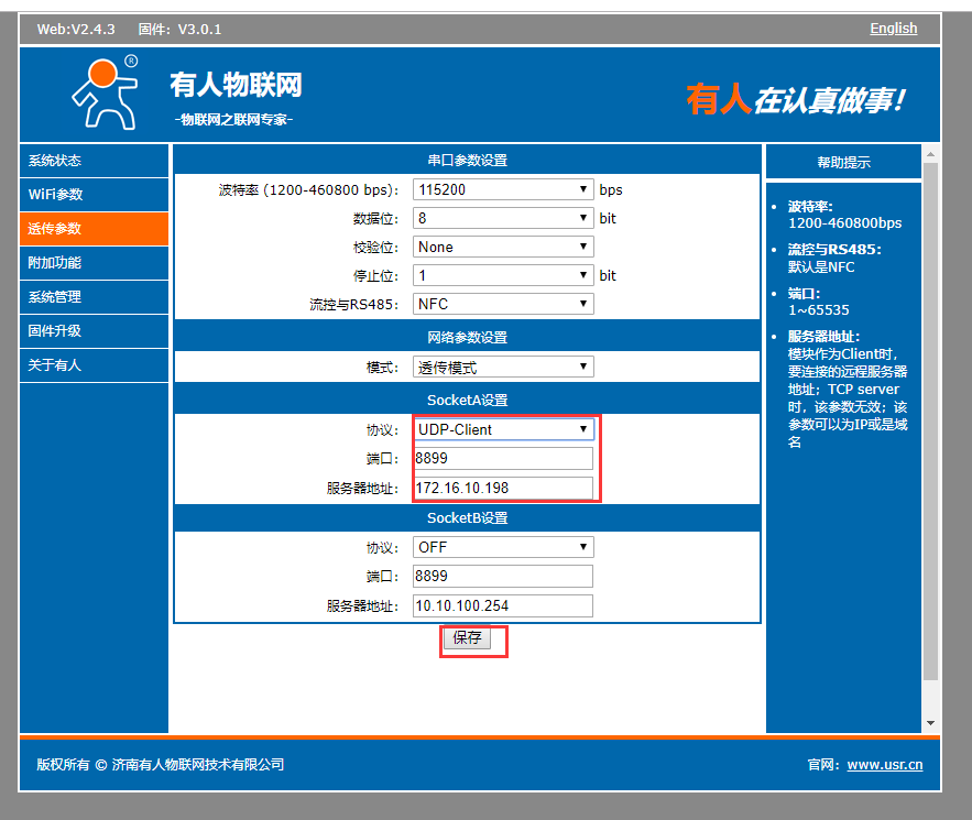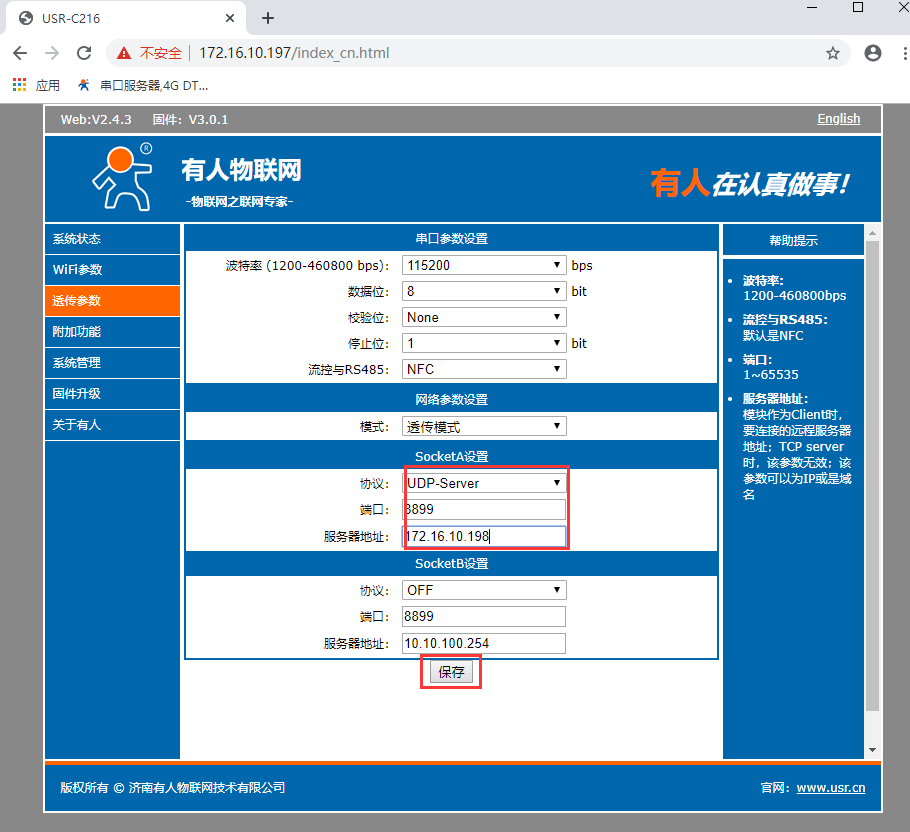 1、用查到的IP地址,進(jìn)入216配置網(wǎng)頁(yè),設(shè)置socketA協(xié)議為UDP server,UDP server端口8899 。socketA服務(wù)器地址可以設(shè)置為電腦的IP,這個(gè)服務(wù)器地址是代表WiFi模塊串口接收到數(shù)據(jù)后,將數(shù)據(jù)發(fā)送到網(wǎng)絡(luò)端,如果模塊沒有記錄來源IP和端口的話,模塊自動(dòng)將數(shù)據(jù)發(fā)送到服務(wù)器地址和socketA端口。設(shè)置完成后重啟WiFi模塊。