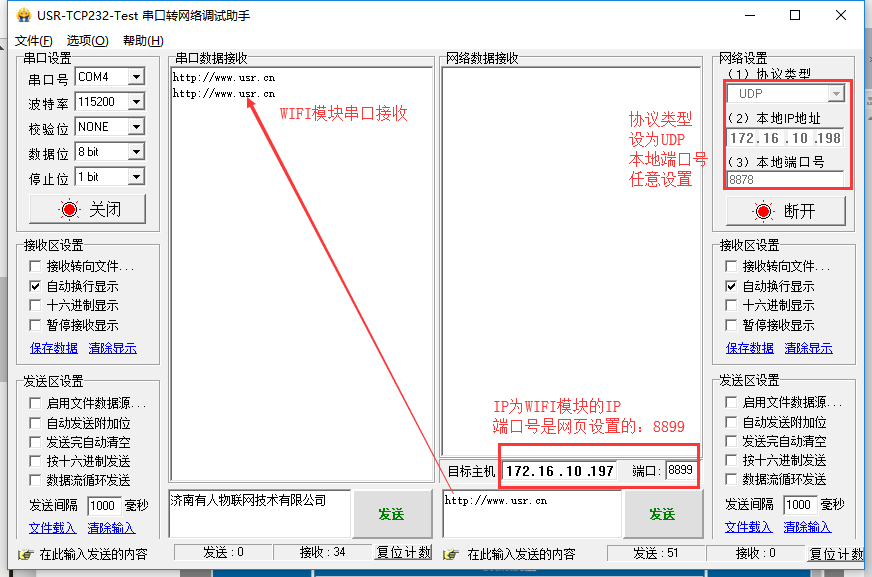 軟件自動(dòng)記錄WIFI模塊發(fā)起連接的IP和端口號(hào),網(wǎng)絡(luò)發(fā)送數(shù)據(jù)就指向此IP和端口