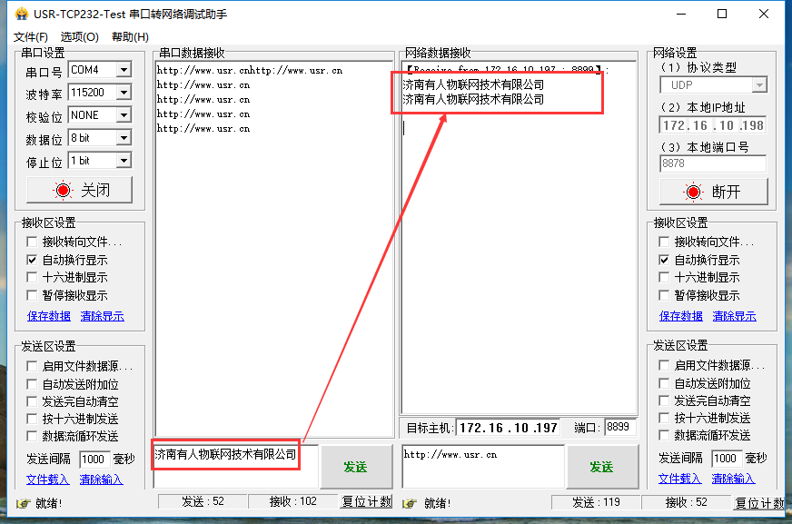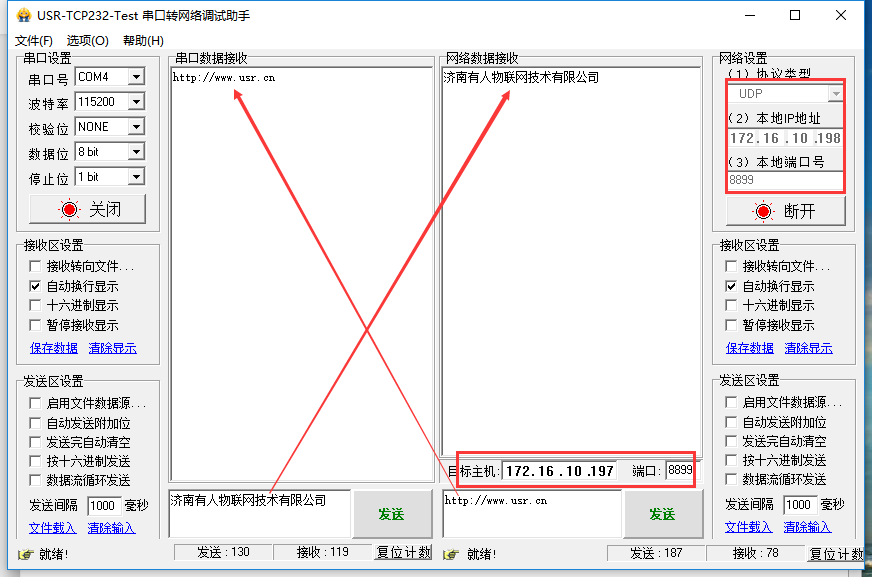 網(wǎng)絡(luò)向串口:目標(biāo)主機(jī):172.16.10.197端口:8899