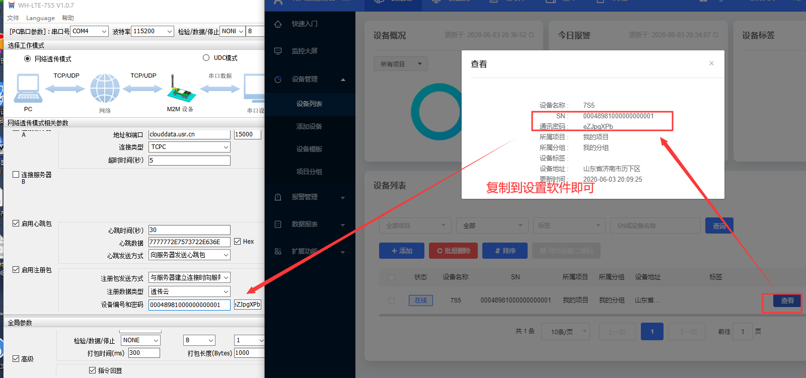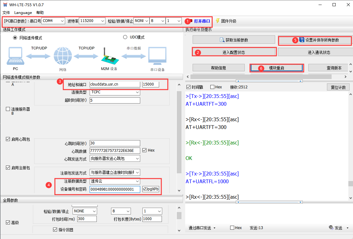 1、點擊進入配置狀態,返回OK說明進入配置狀態成功-->配置相關參數-->點擊設置所有參數-->點擊設備重啟