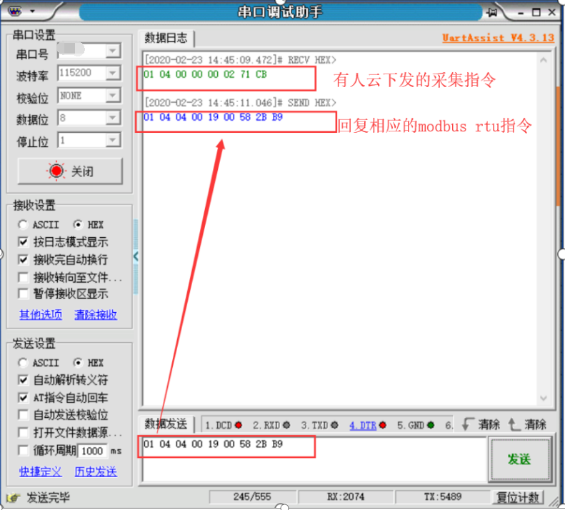 4、看到有人云主動下發的采集指令,然后給有人云回復相應的modbus rtu指令;