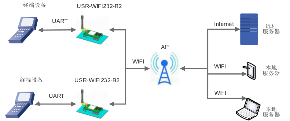 本案例接線:終端設(shè)備(串口)----(串口)模塊----wifi----路由器-----wifi------電腦