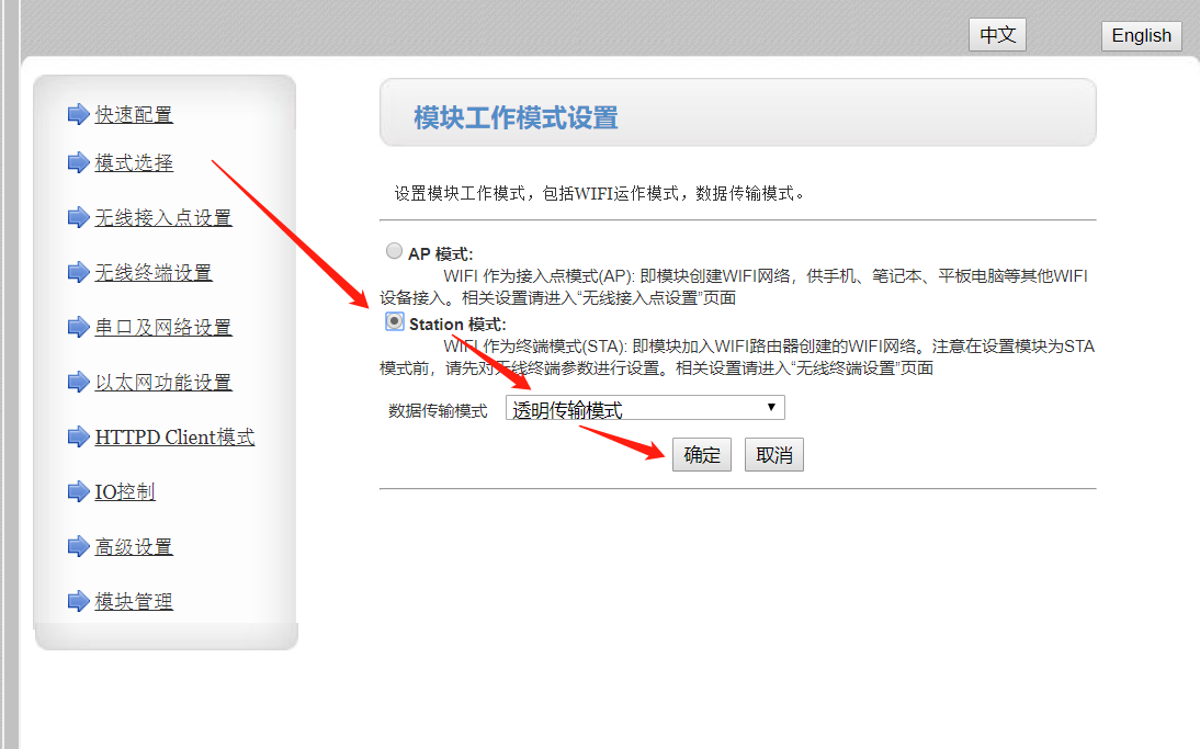 2.用瀏覽器打開B2的IP地址(出廠默認(rèn)10.10.100.254),用戶名和密碼均是admin內(nèi)置網(wǎng)頁的賬號和密碼都是admin,進(jìn)入以后選擇模式選擇模式選擇為sta模式,點(diǎn)擊確定;(先不要重啟,等設(shè)置完所有的參數(shù)再重啟設(shè)備)