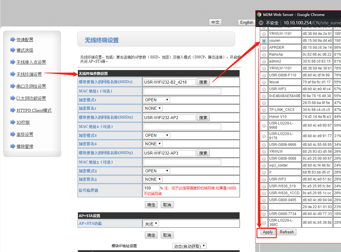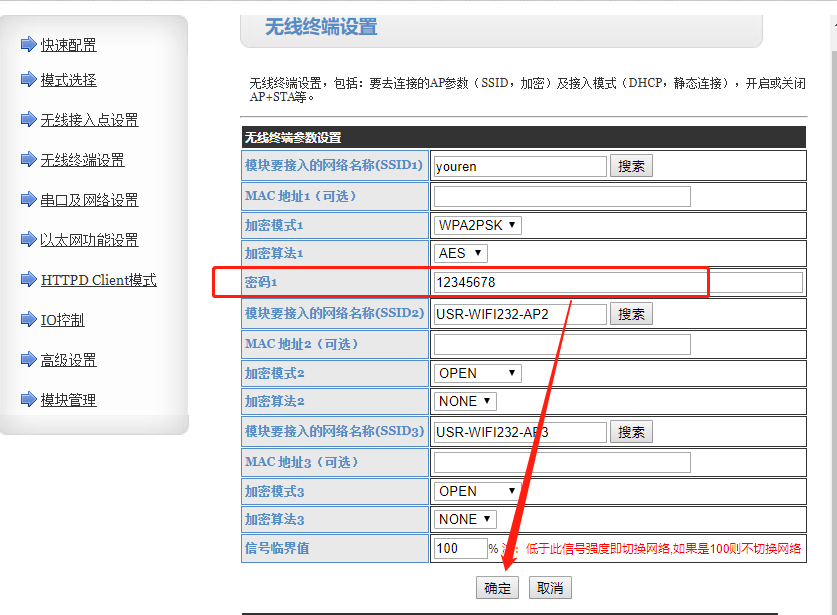 3.進(jìn)入無線終端設(shè)置,搜索要連接的WiFi,選中以后點(diǎn)擊確定,輸入密碼,設(shè)置完成后同樣需要點(diǎn)擊確定