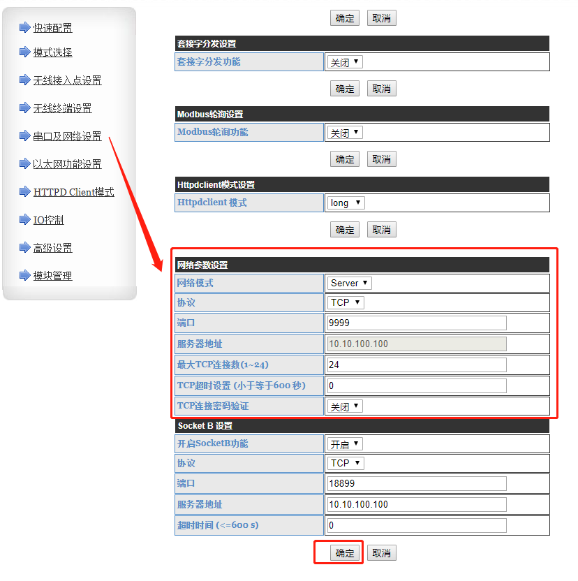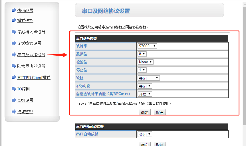 4.在模塊“串口與網(wǎng)絡(luò)設(shè)置”中可設(shè)置模塊的串口參數(shù)(串口參數(shù)要與您要接的串口設(shè)備一致),點(diǎn)擊確認(rèn)。