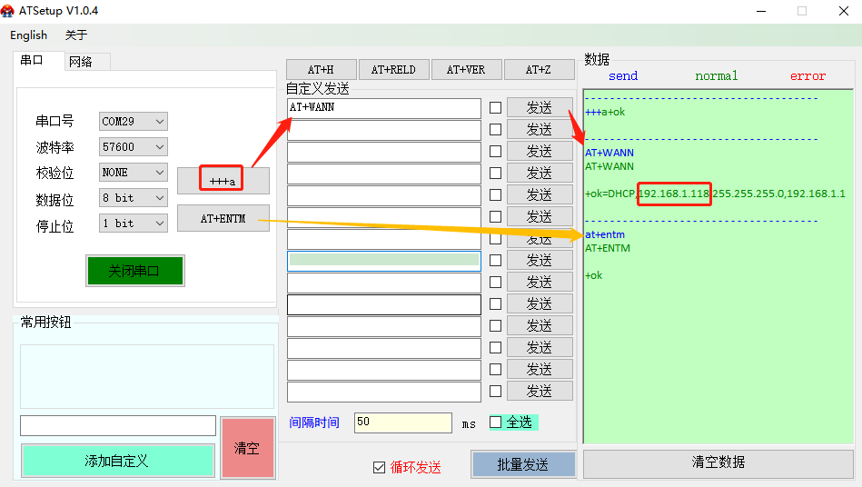 6.使用AT設(shè)置軟件打開串口,點(diǎn)擊“+++a”模塊返回+ok進(jìn)入配置狀態(tài),發(fā)送AT+WANN查詢模塊STA模式下獲取的IP, 查詢完成使用AT+ENTM退出配置, 點(diǎn)擊關(guān)閉串口。