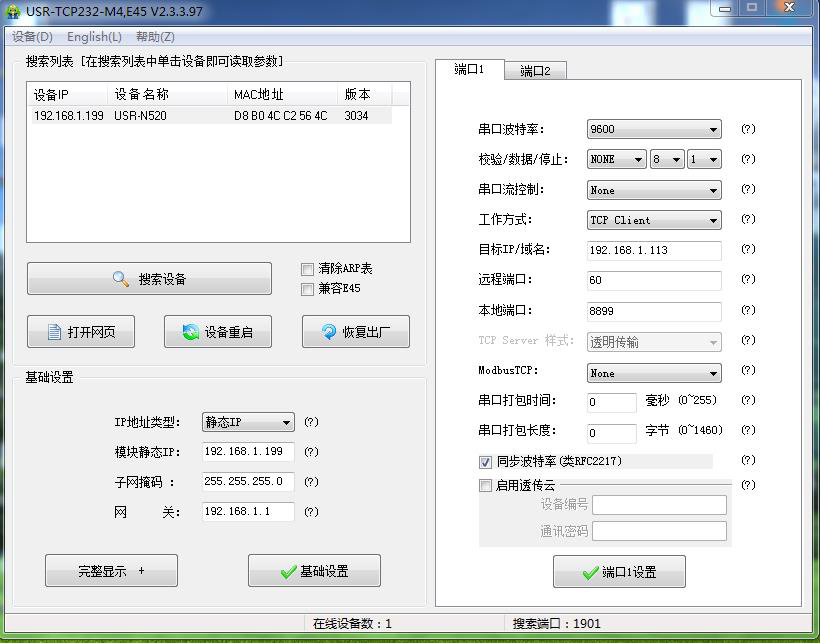 USR-N520網線和電腦直連,IP設置同網段,在電腦用M4設置軟件去搜索USR-N520的IP,設置USR-N520的參數,做TCP client。遠程服務器地址填電腦IP,遠程端口填電腦server端口。