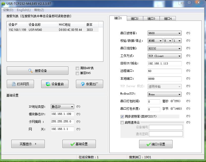 USR-N540網線和電腦直連,IP設置同網段,在電腦用M4設置軟件去搜索USR-N540的IP,設置USR-N540的參數,做TCP client。遠程服務器地址填電腦IP,遠程端口填電腦server端口。