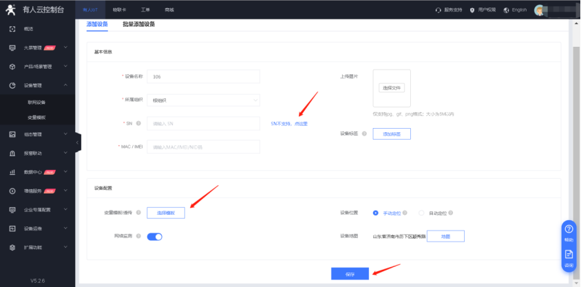 1、注冊有人云賬號,登陸,有人云網址:https://account.usr.cn/mp_scada,在設備管理的界面添加聯網設備。并添加對應的MODBUS云端輪詢模板。點擊保存查看有人云平臺生成的設備編號以及密碼。