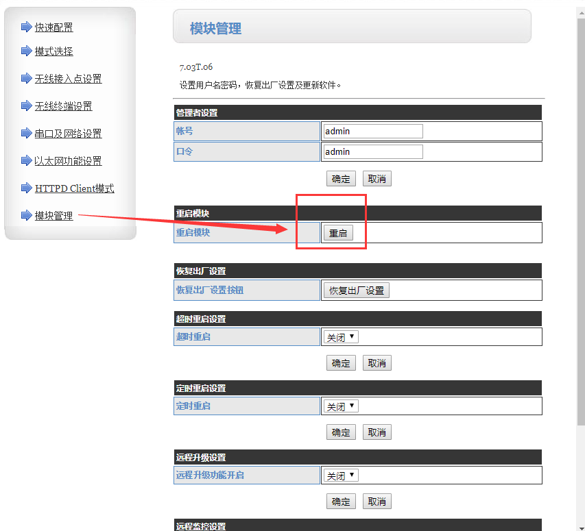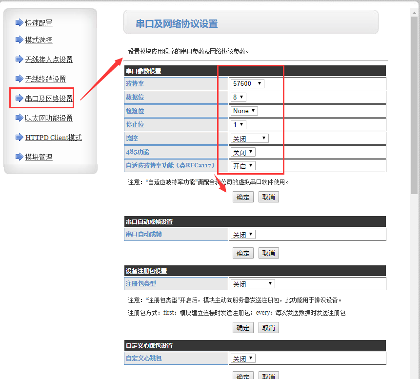 4、模式選擇: STA,modbus rtu<=>modbus tcp協議轉換。 注:確定后,不用立刻重啟,等著全部修改完成一塊重啟。
