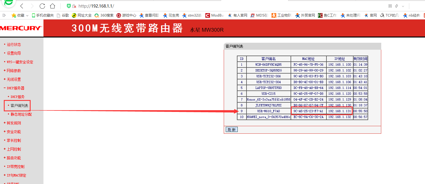 9、登進路由器的內置網頁可以看到此時路由器分配給W610的ip是192.168.1.131