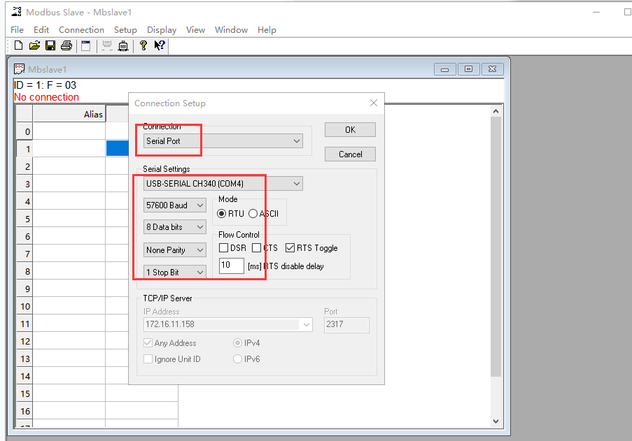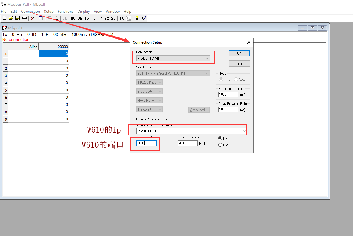 10、打開modbus poll和modbus slave軟件,分別設置參數,選擇modbus tcp/ip協議,然后連接W610的端口和ip;