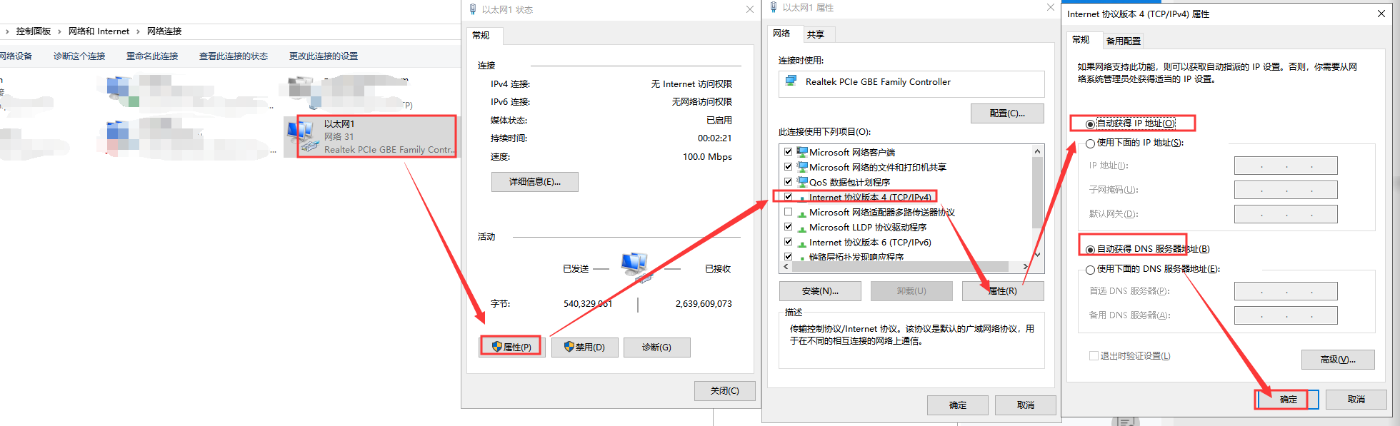 打開網(wǎng)絡(luò)共享中心,雙擊對(duì)應(yīng)的網(wǎng)絡(luò)適配器,點(diǎn)擊屬性,選擇IPV4,點(diǎn)擊屬性,修改電腦為自動(dòng)獲取IP,然后點(diǎn)擊確定。(如果電腦本來就是自動(dòng)獲取IP,這一步可以跳過)點(diǎn)擊詳細(xì)信息可以查看到電腦獲取的IP地址: