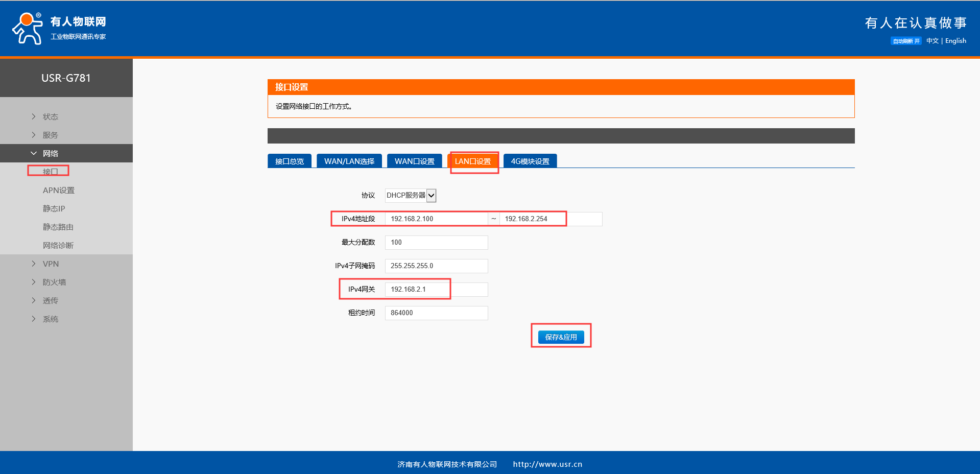 1>進(jìn)入網(wǎng)絡(luò)---接口---LAN口設(shè)置,修改IPv4地址段和IPv4網(wǎng)關(guān),例如下圖,都修改為192.168.2.XXX