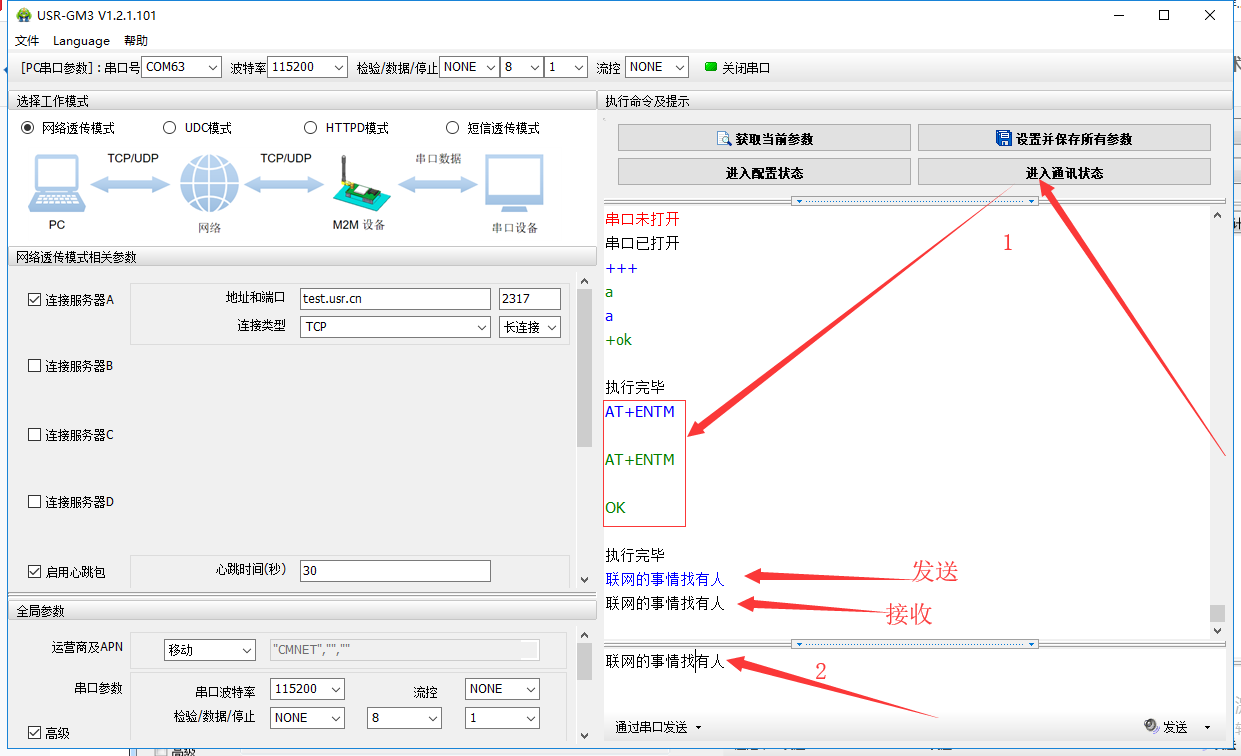 (5)DTU出廠默認(rèn)連接的是我司的測(cè)試服務(wù)器:test.usr.cn:2317;串口向服務(wù)器發(fā)送什么數(shù)據(jù),服務(wù)器就將接收到的數(shù)據(jù)返回到串口。