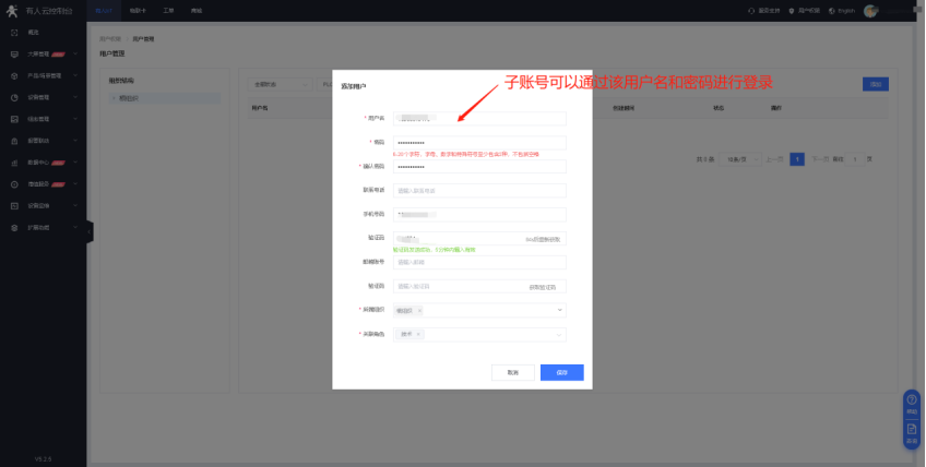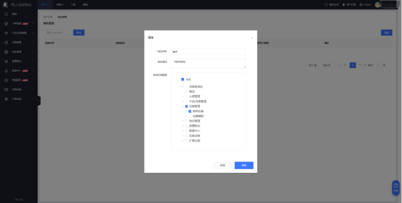 2、登錄有人云控制臺之后,點擊右上角的用戶權限,點擊角色管理。添加并填寫相關的角色信息以及菜單應用權限。