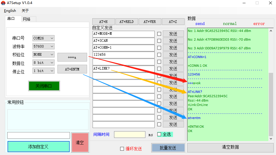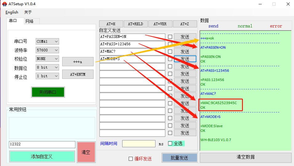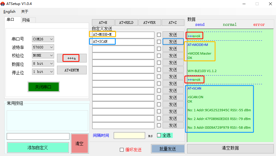 正確打開串口后,點擊“+++a”,接收區顯示“a+ok”說明模塊進入了命令行模式。