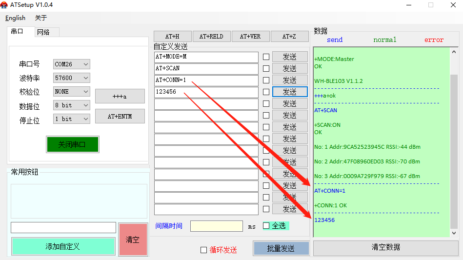 如果搜索到從設備,假如序號是 1,可以使用快速連接命令進行連接。