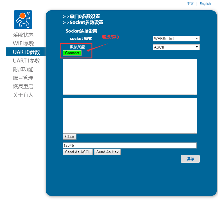 1. 登錄模塊內(nèi)置網(wǎng)頁(yè)后,選擇“UART0參數(shù)”,選擇socket模式為“WEBSocket”,點(diǎn)擊保存重啟。
