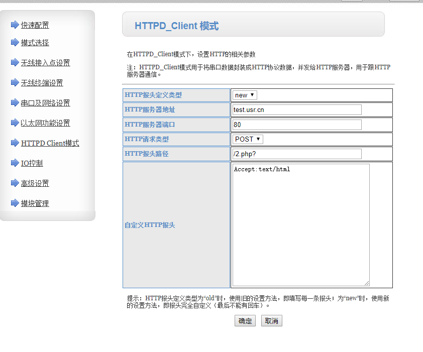5. 在httpd client模式下選擇POST模式、test.usr.cn為我們的測試服務器,是您發送什么返回什么,設置完成后確定。