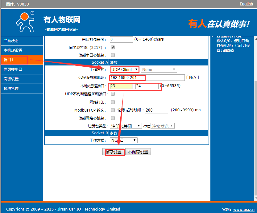 4、單擊端口1,設置socket A參數,工作方式選擇UDP Client,遠程地址填192.168.0.201,本地端口填23、遠程端口24保存設置,重啟。