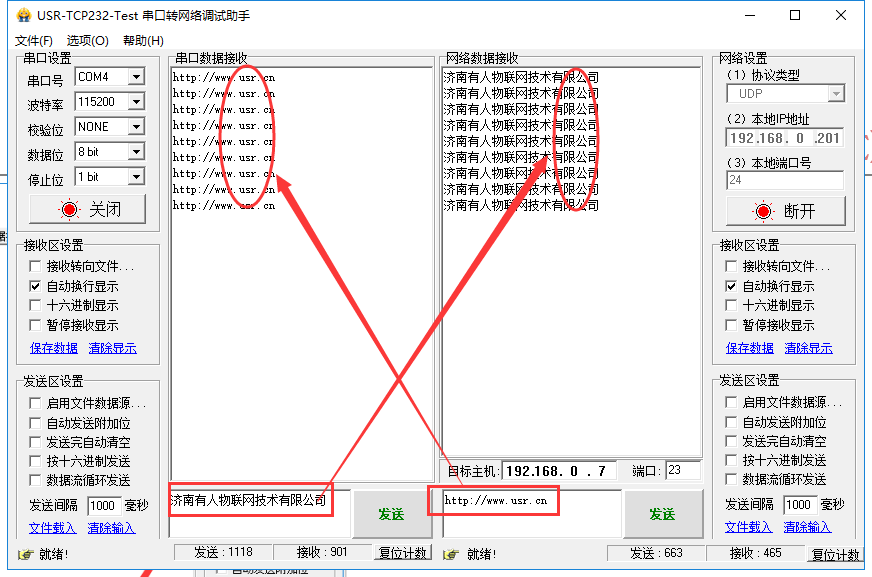 6、單擊發送,由此實現串口端和網絡端的通信。
