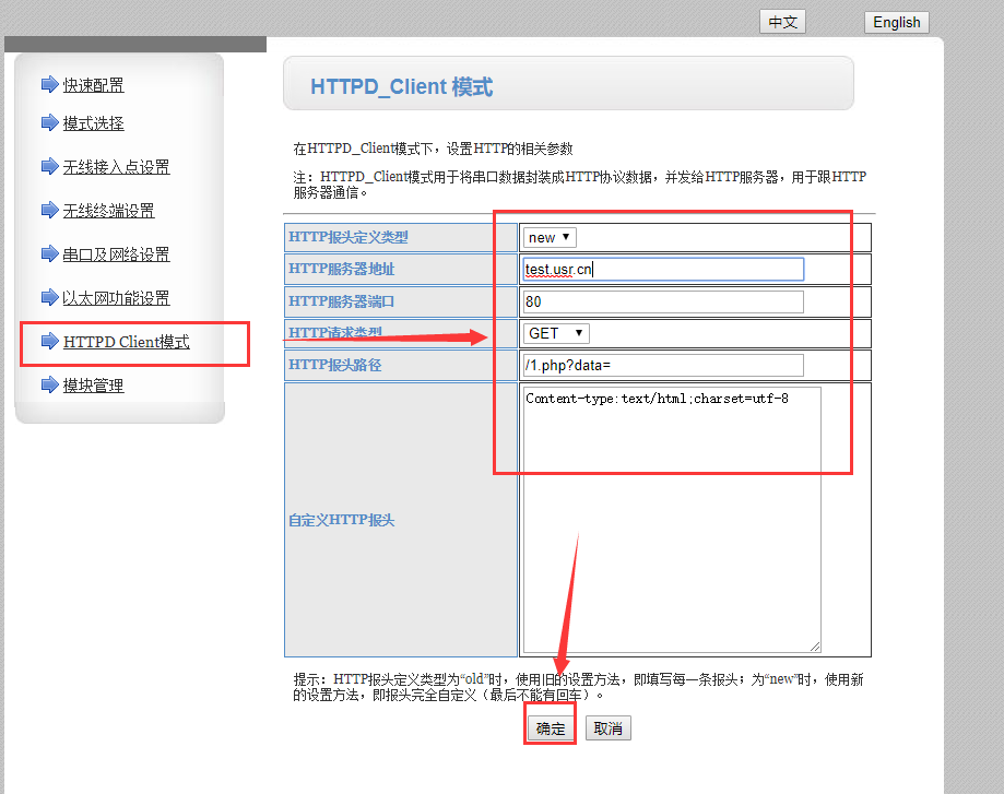 5、點(diǎn)擊httpd client 模式,HTTP報(bào)頭定義類(lèi)型為new,HTTP服務(wù)器地址:test.usr.cn, HTTP服務(wù)器端口號(hào)為80,HTTP報(bào)頭路徑為/1.php?data=,設(shè)置完成點(diǎn)擊確定,在模塊管理點(diǎn)擊重啟。