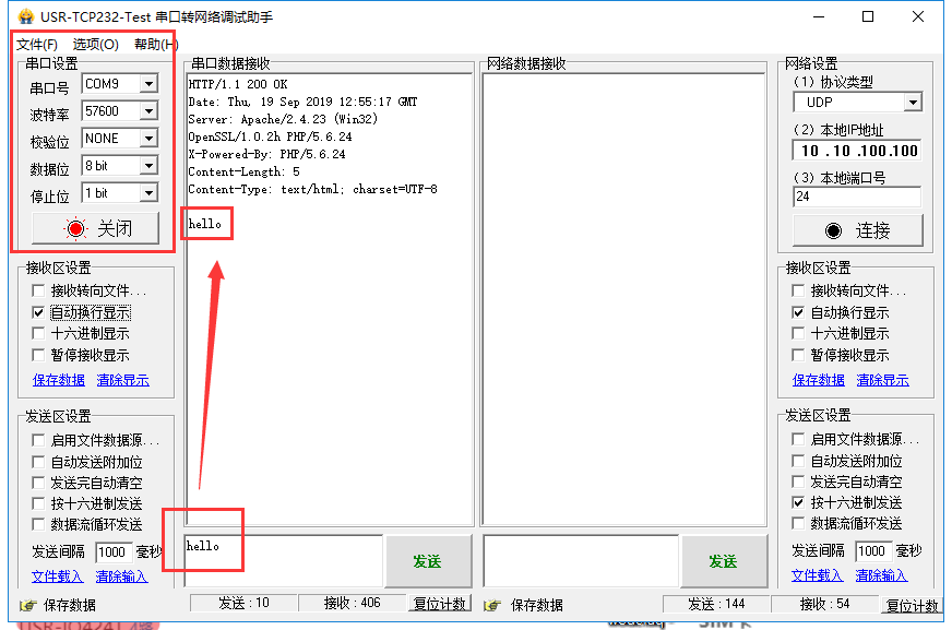 6、打開(kāi)小黃人軟件,選擇串口號(hào),波特率,校驗(yàn)位數(shù)據(jù)位停止位如圖所示,在串口端發(fā)送hello,如圖所示。