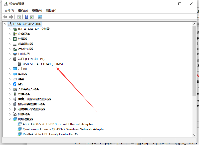 5、在設備管理器中查看端口信息,確定301串口使用的串口號,如下圖所示電腦端口號為COM5。