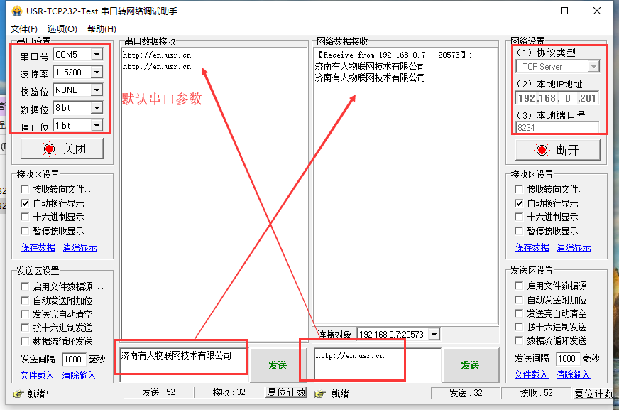 將軟件串口設置中的串口號配置為COM4。由于設備默認協(xié)議類型為TCP Client,所以電腦端連接設備需要設置為TCP server。服務器IP設置為電腦IP:192.168.0.201。端口號設置為301默認參數(shù)中的“連接目標端口”:8234