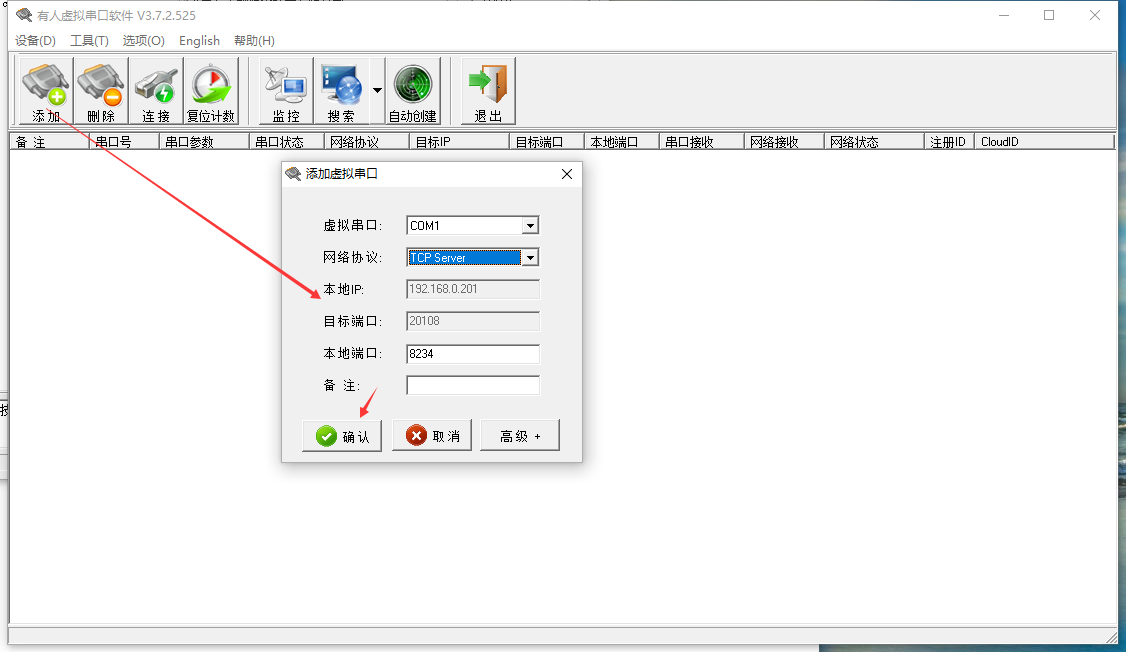 打開虛擬串口軟件,點擊“添加”在彈出的窗口中設置虛擬串口信息,由于上述301設備采用TCP Client協(xié)議,所以此處網(wǎng)絡協(xié)議設置為TCP Server。目標IP和目標端口設置為301的IP和端口。然后點擊“確定”,建立虛擬串口COM1。