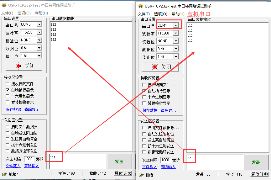 8、打開兩個USR_TCP232_Test軟件,一個連接COM4,一個連接虛擬串口COM1,實現(xiàn)兩個串口直接數(shù)據(jù)互發(fā)。