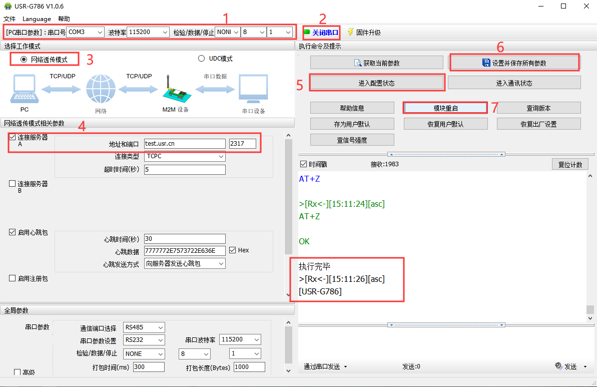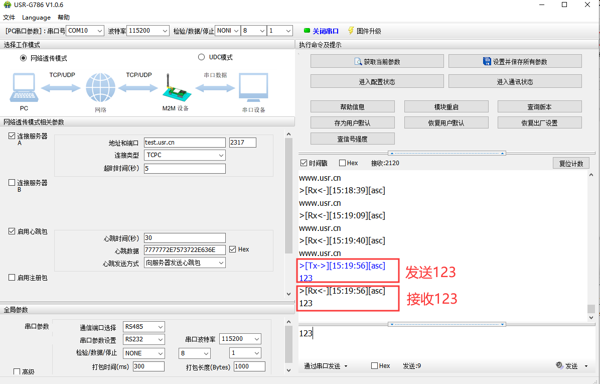 4. G786出廠默認是232串口配置參數,485串口通信,以上參數均使用232串口設置的,設備重啟以后,需要打開485串口,在485串口進行通信,下圖可以看的發送“123”,測試服務器回復“123”,表示已經測試成功;